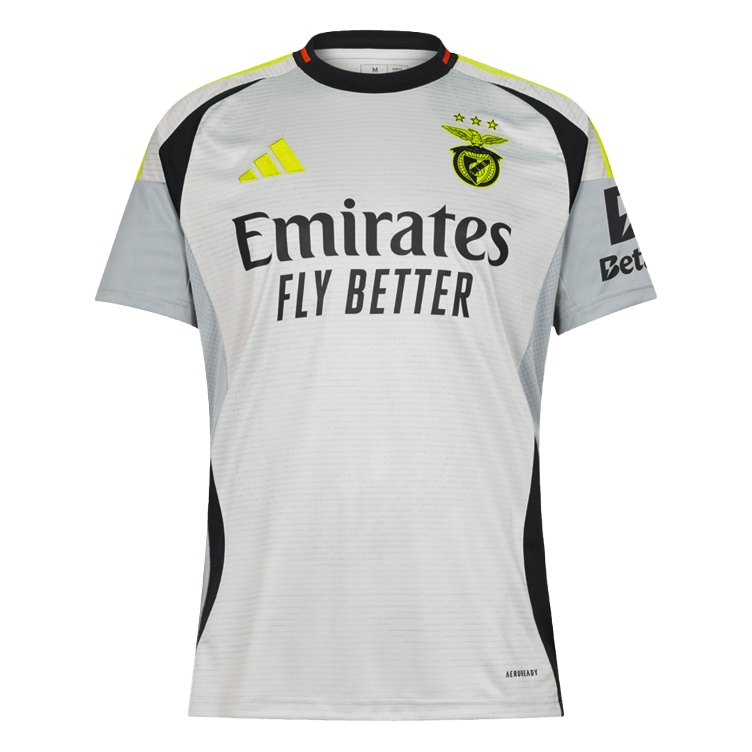 Description about theBenficajersey: Benfica Jersey?Third Away?2024/25?OUT NOW!?The Benfica Jersey third away 2024-25 was launched on 1 August 2024. Benfica Jersey third away is based is in???Grey???with a black and solar-yellow badge on the front and stripes on the shoulder- and a little red on the neck. 3 stars are proudly displaced on the left chest, symbolizing the club’s great?achievements. Specially, Benfica?jersey shows the whole world the the glow of the brightest star: the yellow solar. The appearance of this Benfica camiseta futbol is not only suitable for cheer up on the pitch, but also super suitable to wear when you work out. It’s time to show your support for the iconic football club with this stylish and high-quality Benfica jersey.