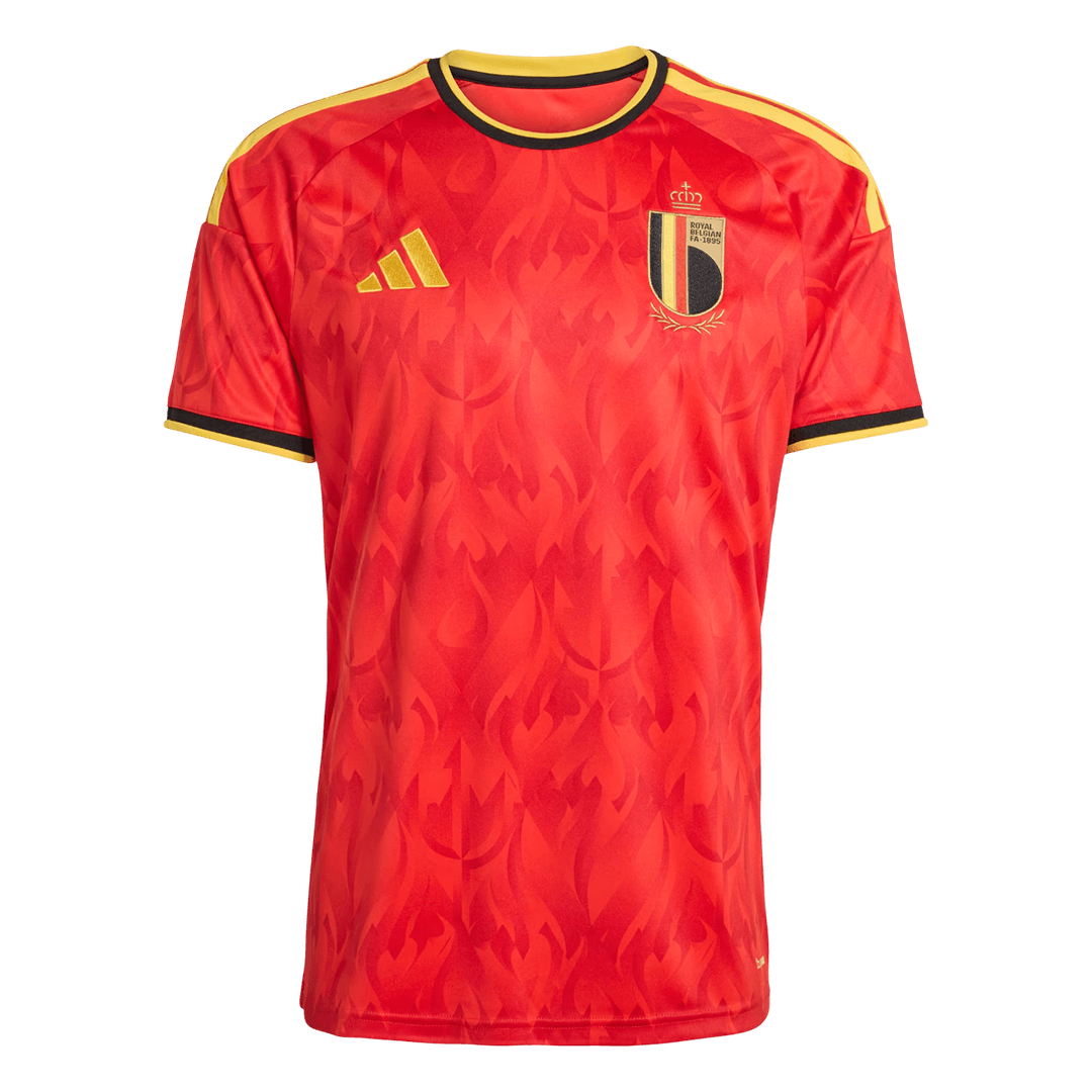 TheBelgium Home Soccer Jersey World Cup 2026captures the heart of the Red Devils’ identity. Featuring adeep red basewithgold and black detailing, thisBelgium jerseysymbolizes courage and determination. The standout design mergestulip shapes with flames, forming a fiery devil motif that celebrates Belgium’s bold football spirit.